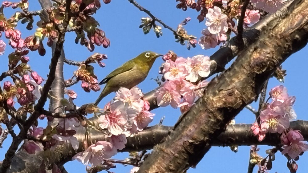 七分咲きくらいでしょうか、メジロが沢山蜜を吸いに来ていました。